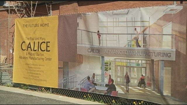 School officials held a special topping off ceremony for the Paul and Mary Calice and Mildred Barton Advanced Manufacturing Center.