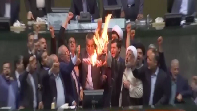 Iranian lawmakers have set a paper U.S. flag ablaze at parliament after President Donald Trump's nuclear deal pullout, shouting, "Death to America!"
